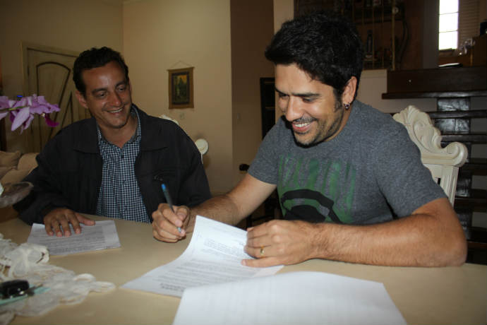 Ao lado de Ney Lima, Sideral assina o contrato para a apresentação em Alfenas (Foto: Ascom/Prefeitura)