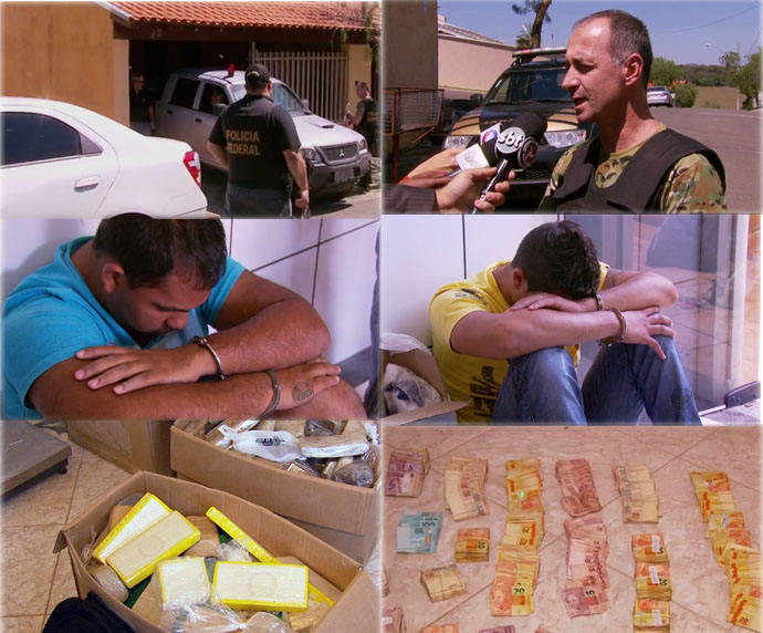 Acima, imagens das drogas e do dinheiro apreendido, além do delegado Giroto em entrevista à imprensa. Abaixo, os suspeitos presos: Euclides Urbano e André Souza, que aparece com uma tatuagem do coringa. Esse tipo de tatuagem é conhecida no meio do crime como sendo a que identifica assassinos de policiais (Fotos: EPTV/Reprodução e Arquivo)