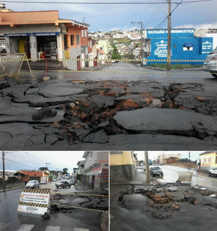 Acima, cratera formada na rua Juscelino Barbosa, esquina com a avenida Lincoln Westin da Silveira. Abaixo, diversos trechos de Alfenas que foram atingidos pela chuva de sexta-feira (Fotos: Alessandro Emergente e Reprodução/WhatsApp)