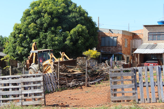 Uma máquina derrubou cercas feitas nos terrenos, onde havia algumas plantações de hortaliças e frutas. Uma equipe da Polícia Militar acompanhou todo o procedimento.