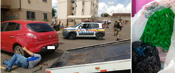 O veículo utilizado no roubo foi apreendido e, na casa de um adolescente suspeito, foram encontrados pinos para cocaína (Fotos: PM)