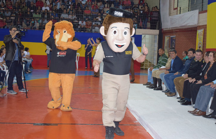Os mascotes do Proerd alegraram as crianças durante a cerimônia de formatura realizada pelo 64° Batalhão da PM (Fotos: Alessandro Emergente)