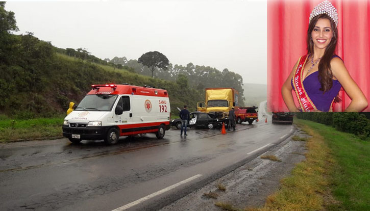 A soldada da PM (no detalhe quando foi eleita Miss Alfenas) morreu ainda no local do acidente (Fotos: Redes sociais e Arquivo/Alfenas Hoje)