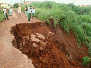 Moradores da Rua Caetés, no Bairro Vila Teixeira, tiveram uma surpresa desagradável na manhã deste domingo: Parte da rua – que não é asfaltada - foi “engolida” pelas águas da chuva, formando um enorme buraco na via pública.