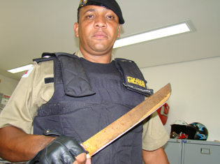 Na foto, Tenente Lombardi mostra facão usado no roubo