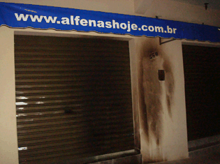 A fachada da sede do Alfenas Hoje, na rua Afrânio Peixoto, no Bairro Jardim São Carlos, foi alvo de um incêndio criminoso na noite desta terça-feira (06/04). O odor no local é semelhante a gasolina, provável liquido usado para provocar as chamas.