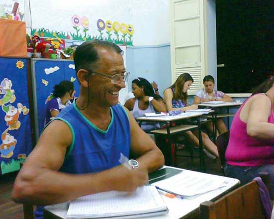 João Bispo, 61 anos, não se incomoda com a mobília e não quer se afastar dos colegas de sala