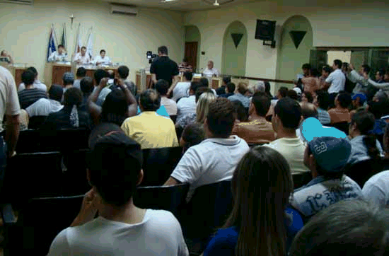 A reunião foi tensa. Várias pessoas, muitos delas usando nariz de palhaço, compareceram a sessão para protestarem contra o projeto, que estabelece o aumento do subsídio dos vereadores de R$ 5,5 mil para R$ 8 mil. Elas lotaram as dependências da Câmara Municipal, o que deixou muitos vereadores visivelmente incomodados.