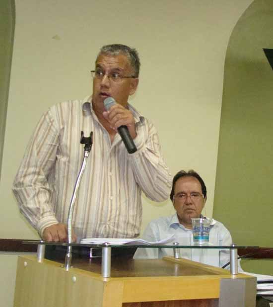 O sindicalista Vagner Soares ao propor um novo piso salarial e, ao fundo, o líder do governo na Câmara Municipal, vereador Francisco da Cunha Neto (Prof. Chico/PDT)