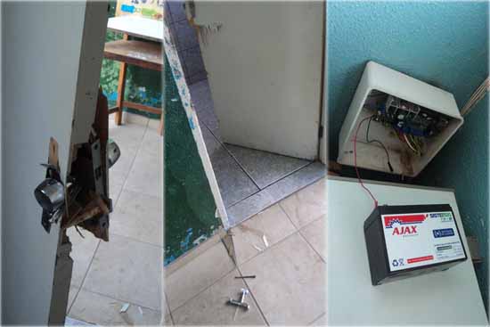 Acima, imagens da porta arrombada, de uma torneira que foi arrancada e da