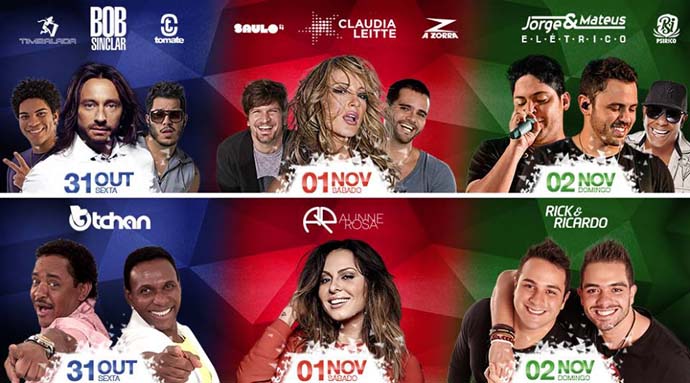 As bandas Tomate e Timbalada também se apresentam, nessa primeira noite, no trio elétrico. A segunda noite, 1˚ de novembro, será comandada por Cláudia Leite e ainda conta com A Zorra e Saulo no trio elétrico. Na última noite, 2 de novembro, será a vez dos foliões curtirem Jorge&Mateus e Psirico.