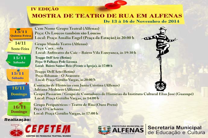 “As diversas manifestações culturais transformam uma sociedade tornando seus cidadãos pessoas mais críticas e defensoras de suas ideias. E, dentro deste contexto, podemos citar o teatro, uma arte milenar como um instrumento primordial para a formação social”. Baseados neste princípio, a Secretaria Municipal de Educação e Cultura de Alfenas e o Centro de Pesquisa Teatral Mundo (Cepetem) firmaram uma parceria para realizar a IV Edição da Mostra de Teatro de Rua, que acontecerá de 13 a 16 de novembro.