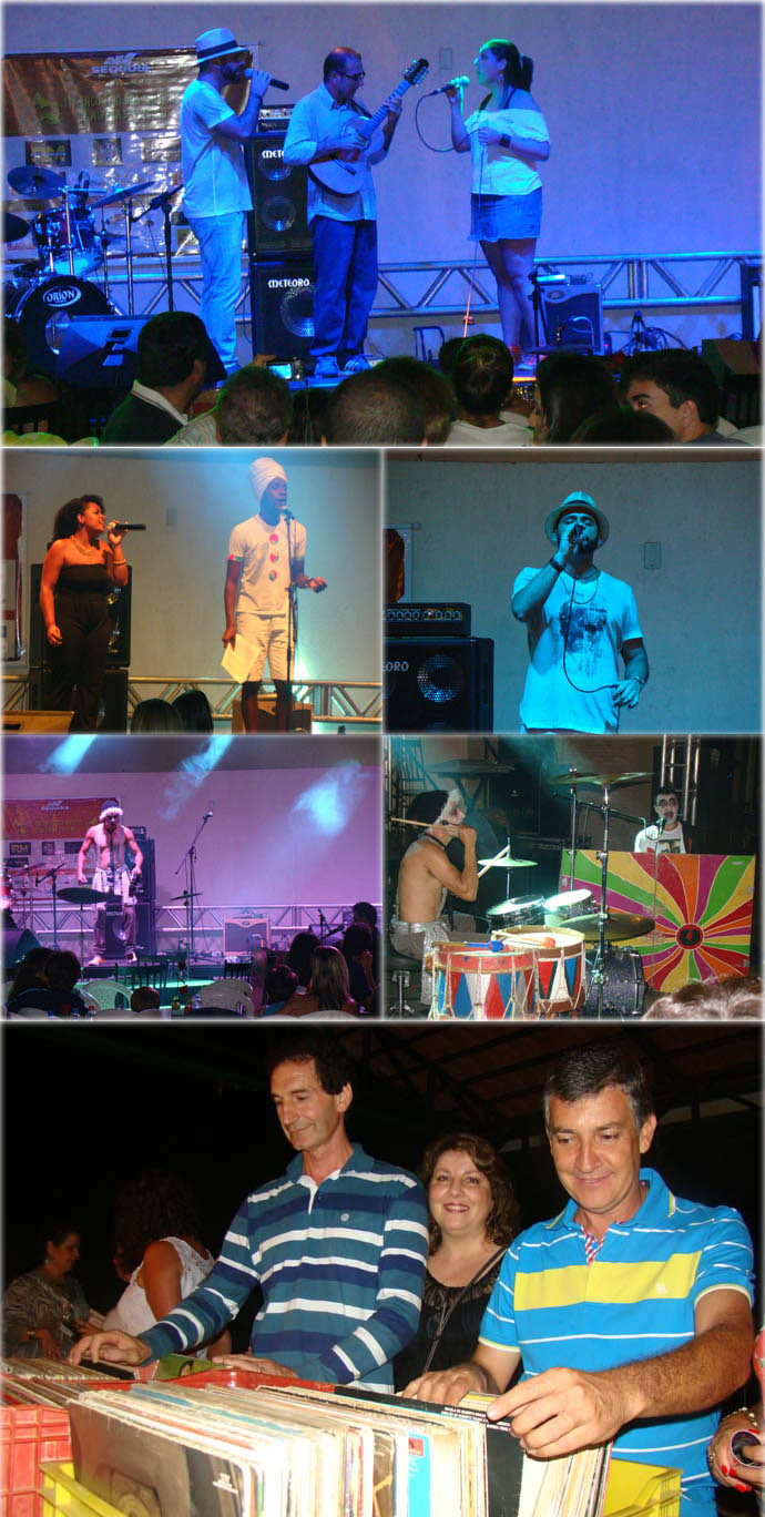 Acima, Tutuca e Clarice foram chamados ao palco por Ivan Vilela e, na sequência de fotos, aparecem Rodrigo Miquelino com Marina Moreno e o próprio Tutuca, além da apresentação de "O Clown". Abaixo, a Feria de Vinil realizada paralelamente as apresentações (Fotos: Alessandro Emergente)