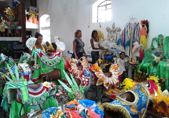 A menos de uma semana dos desfiles de Carnaval, os preparativos estão acelerados na Casa da Cultura. Integrantes de três escolas de samba (São Clemente, Unidos de Santos Reis e Barão do Rio Branco) se revezam e trabalham duro: colam lantejoulas, bordam, ajustam fantasias e reaproveitam objetos de desfiles anteriores para fazer deste carnaval um grande evento.