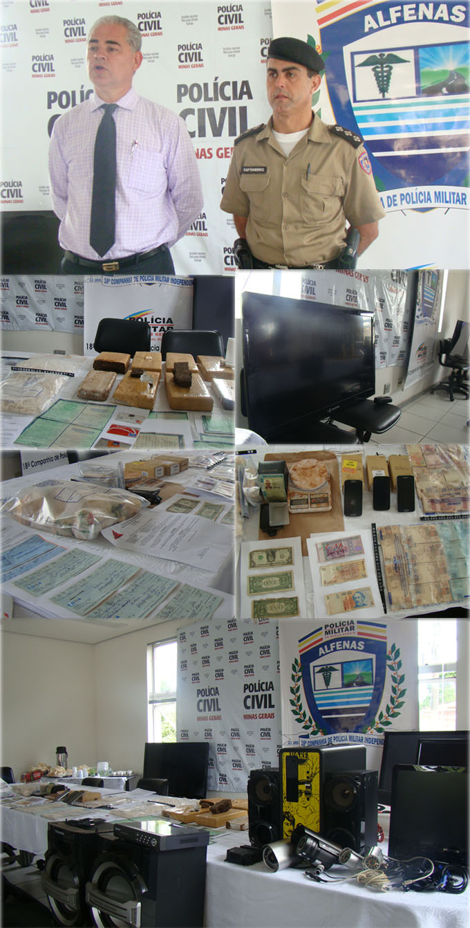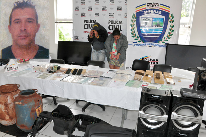 Na quinta-feira, a PM, com apoio da Polícia Civil, cumpriu dois mandados de busca e apreensão em dois endereços de Alfenas. Foram apreendidos 10,2 kg de maconha, 3,7 de pasta-base para preparo de cocaína, 569 cápsulas com cocaína, 52 pedras de crack, além de oito veículos (avaliados em R$ 141 mil) e uma grande quantia em dinheiro, que a Polícia investiga a origem.
