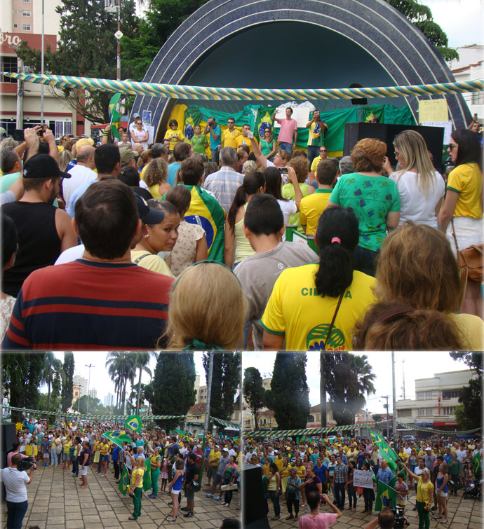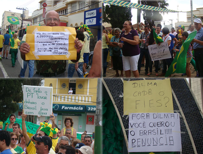 A manifestação antigoverno de Dilma Rousseff reuniu, na tarde deste domingo (15) em Alfenas, cerca de 250 pessoas, segundo estimativa da PM (Polícia Militar). Os manifestantes se reuniram ao lado da Concha Acústica, na Praça Getúlio Vargas, seguindo o protesto que aconteceu em todo o País.