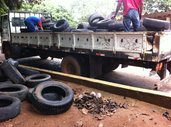 Equipes da prefeitura alertam para objetos que podem servir como criadouros do mosquito, como pneus velhos. Mais de 90% dos focos do mosquitos estão em residências (Foto: Ascom/prefeitura)
