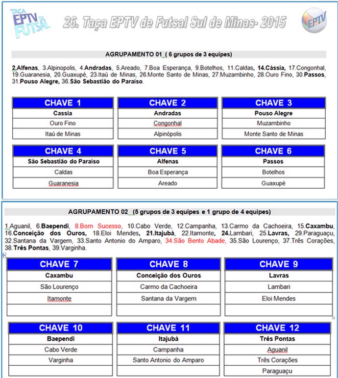 Alfenas está na Chave 5 tendo como adversários Areado e Boa Esperança. São dois agrupamentos com 37 equipes inscritas. No primeiro agrupamento são seis chaves com três equipes cada – a chave de Alfenas integra esse agrupamento. Já o segundo tem seis chaves, sendo cinco com três equipes e uma chave com quatro. (confira como ficaram as chaves no final da reportagem)