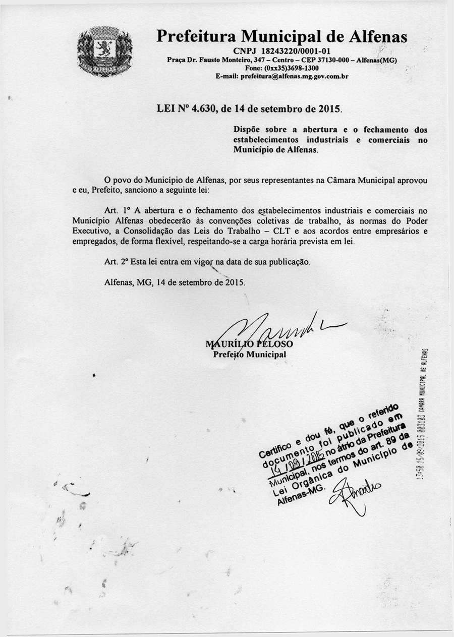 O prefeito Maurílio Peloso (PDT) sancionou a lei municipal (n˚4.630, de 14 de setembro de 2015) que flexibiliza o horário de fechamento do comércio de Alfenas. O texto, aprovado pela Câmara Municipal no mês passado, foi mantido sem nenhum veto parcial por parte do prefeito. A lei não define horários de fechamento, o que pode ser objeto de regulamentação por decreto conforme prevê o texto.