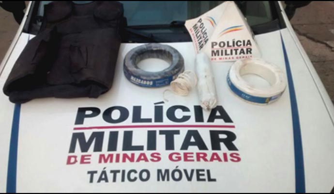 A Polícia Militar apreendeu um explosivo e um colete à prova de balas na terça-feira. O material foi encontrado dentro de um guarda-roupas em uma residência na avenida Jovino Fernandes Salles.