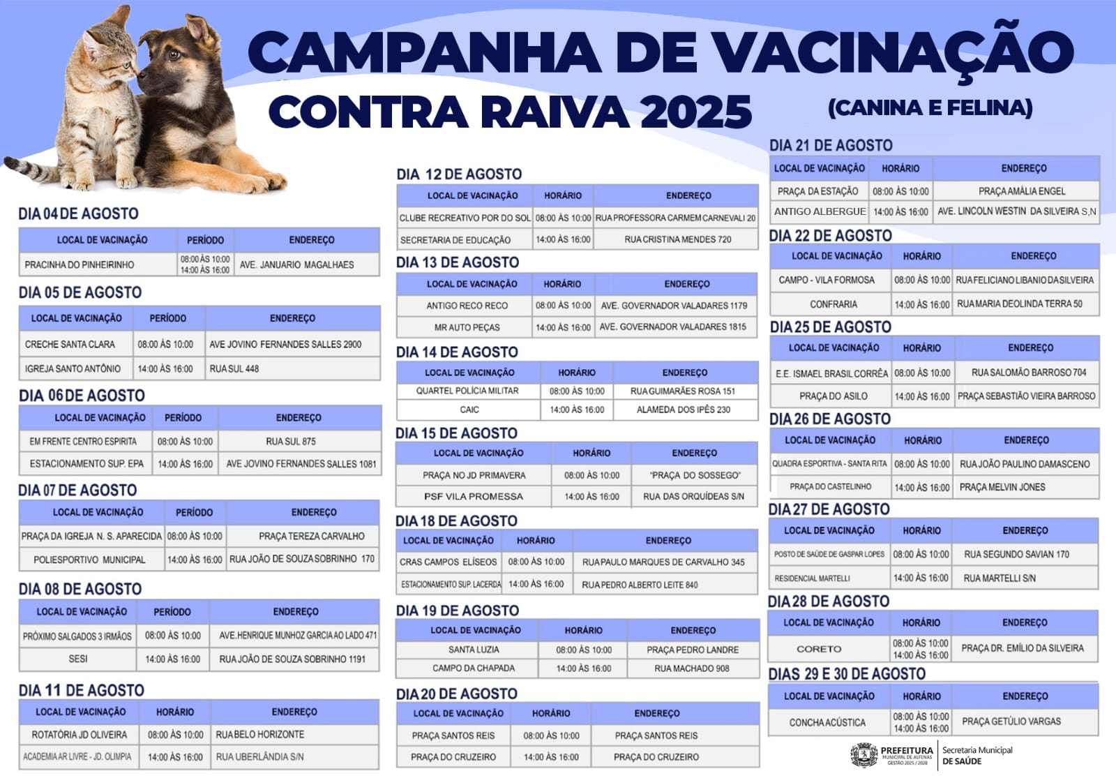 A Prefeitura de Alfenas inicia em 4 de agosto, uma segunda-feira, a campanha de vacinação antirrábica para cães e gatos. A ação tem como objetivo principal proteger os animais e, consequentemente, prevenir a transmissão da raiva para a população. A vacinação ocorrerá em vários pontos da cidade e da zona rural, nos períodos das 8h às 10h e das 14h às 16h.