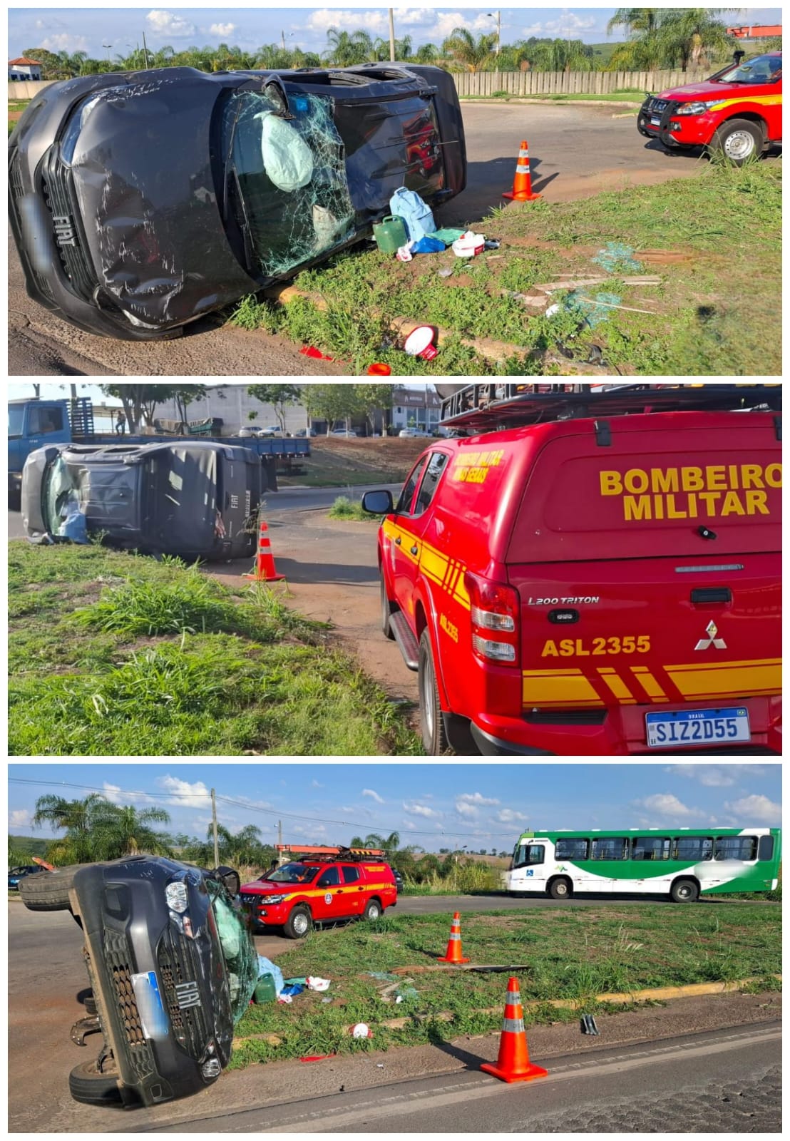 Carro capota após colisão com ônibus no trevo próximo à Unifenas