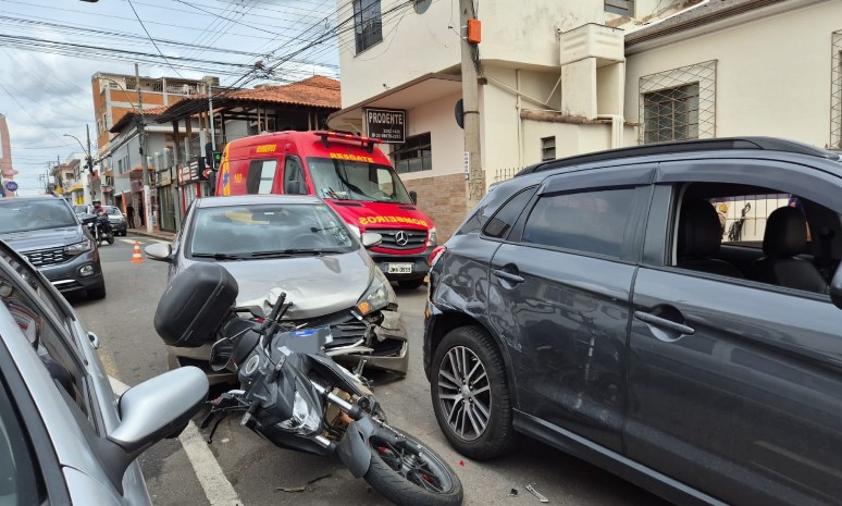 Uma colisão envolvendo três veículos no centro de Alfenas mobilizou o Corpo de Bombeiros na tarde de quarta-feira. O acidente envolveu um Hyundai/HB20 1.6, um Mitsubishi/ASX GLS 2WD e uma motocicleta Honda/CB 300F Twister CBS, conduzida por uma mulher grávida.