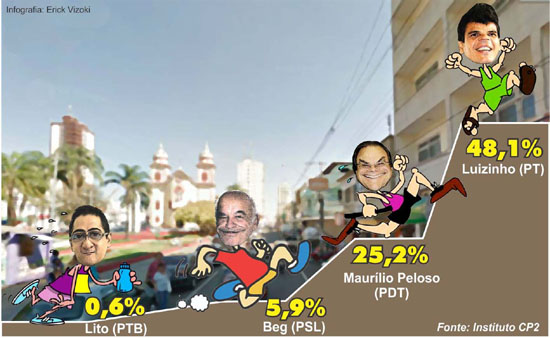 O candidato à reeleição pelo PT tem uma vantagem de 16,4 pontos em relação à soma das intenções de voto nos outros três candidatos a prefeito. Enquanto 48,1% dos eleitores declaram que votarão em Luizinho, 31,7% do eleitorado manifestaram intenção de voto nos candidatos de oposição.