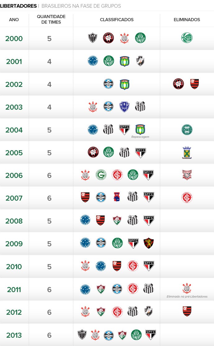 Desde 2000, quando a Libertadores passou a ter o atual formato, o máximo de eliminados que o Brasil teve no mesmo ano foram dois clubes, em 2002: Atlético-PR e Flamengo, justamente dois dos ameaçados agora. Naquele ano, porém, o país teve quatro representantes no torneio, dois a menos do que na atual edição. Grêmio e São Caetano avançaram.
