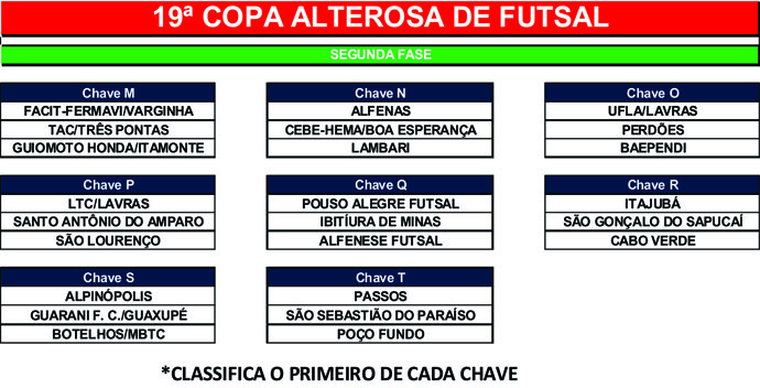 A organização da Copa TV Alterosa de Futsal divulgou, nesta sexta-feira, as chaves da 2ª fase da competição. A seleção de Alfenas está na Chave N e enfrentará Cebe/Hema Boa Esperança e Lambari. Já o Alfenense de Futsal terá pela frente Pouso Alegre e Ibitiura de Minas pela Chave Q.