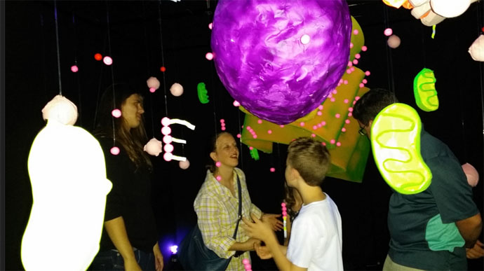 O ambiente é uma sala temática adaptada no Museu da Memória e Patrimônio da Unifal. Ali, alunos do curso de Ciências Biológicas/Licenciatura e Bacharelado, coordenados pelas professoras Andréa Mollica do Amarante Paffaro, dividiram com os colegas da Ciência da Computação, da Fisioterapia e até com estudantes do Ensino Fundamental, a tarefa de montar uma célula gigante utilizando espumas, isopor, tecidos e tintas fluorescentes, que levou cerca de três semanas para ser finalizada.
