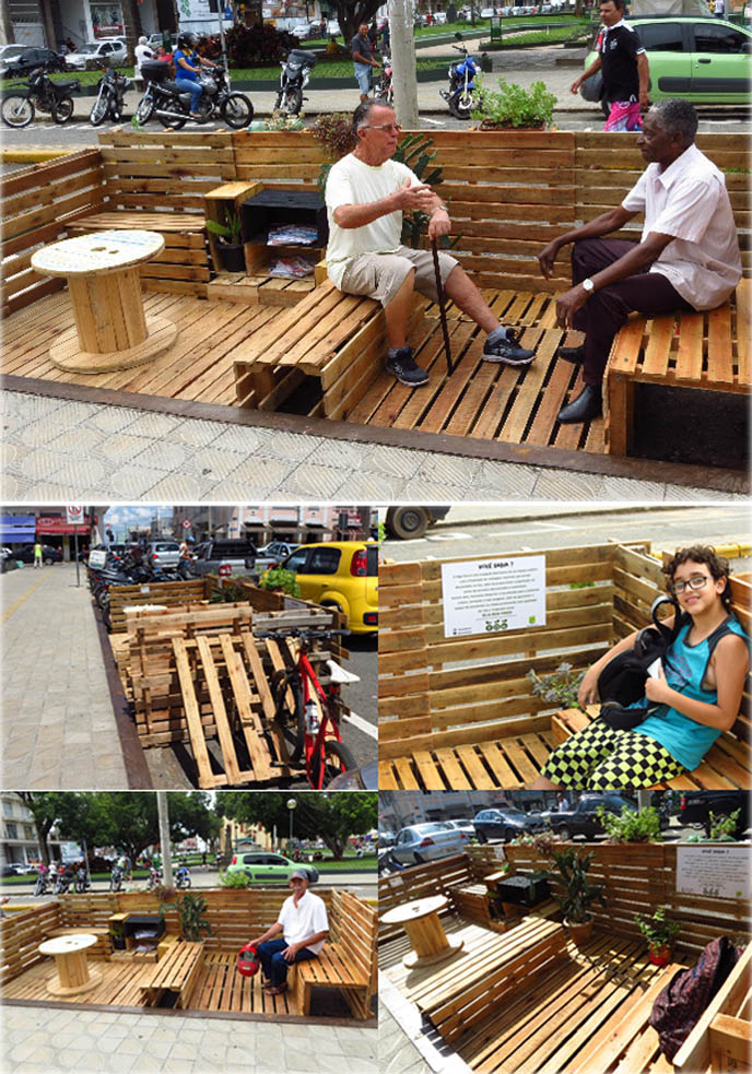 A proposta foi utilizar o espaço destinado a duas vagas para veículos e substituí-las por uma área de convivência, construída com pallets e materiais que seriam descartados. São objetos de baixo impacto ambiental e econômico. A ideia é promover a convivência e valorizar o meio ambiente com a utilização de recursos que promovam a sustentabilidade.