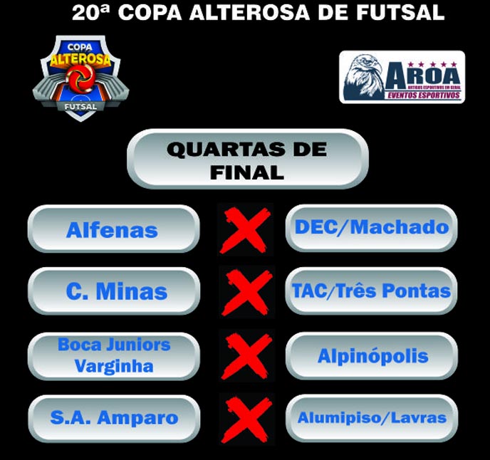 A seleção de Alfenas enfrentará DEC/Machado nas quartas de final da 20ª Copa Alterosa de Futsal. Os confrontos e as datas dessas partidas foram divulgados, nesta quinta-feira (25), pela Associação Regional de Oficiais de Arbitragem (Aroa), organizadora da competição.