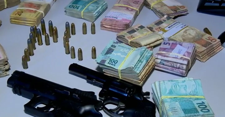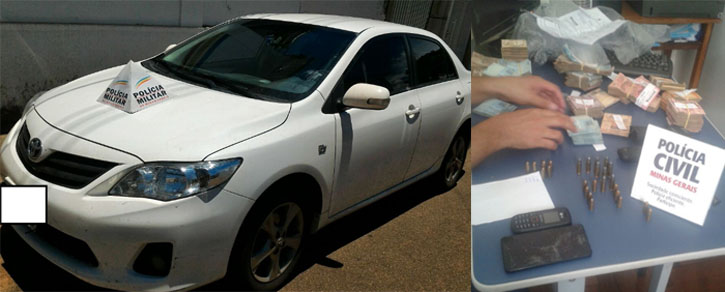 O carro utilizado durante o assalto foi apreendido assim como armas e munições, além de R$ 59,9 mil recuperados (Fotos: Polícia Civil e Polícia Militar)