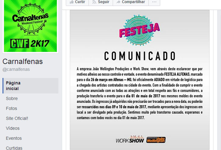 Previsto para 26 de março, festival de música foi adiado para o dia 1º de maio Foto: Reprodução/Facebook/Carnalfenas Weekend Festival)