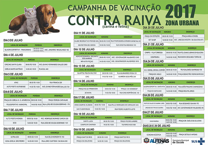 No dia 3 de julho vai começar a campanha de vacinação contra raiva em Alfenas. A estimativa para a campanha deste ano é vacinar 9.875 cães e 1.069 gatos, tanto na zona urbana quanto na zona rural.