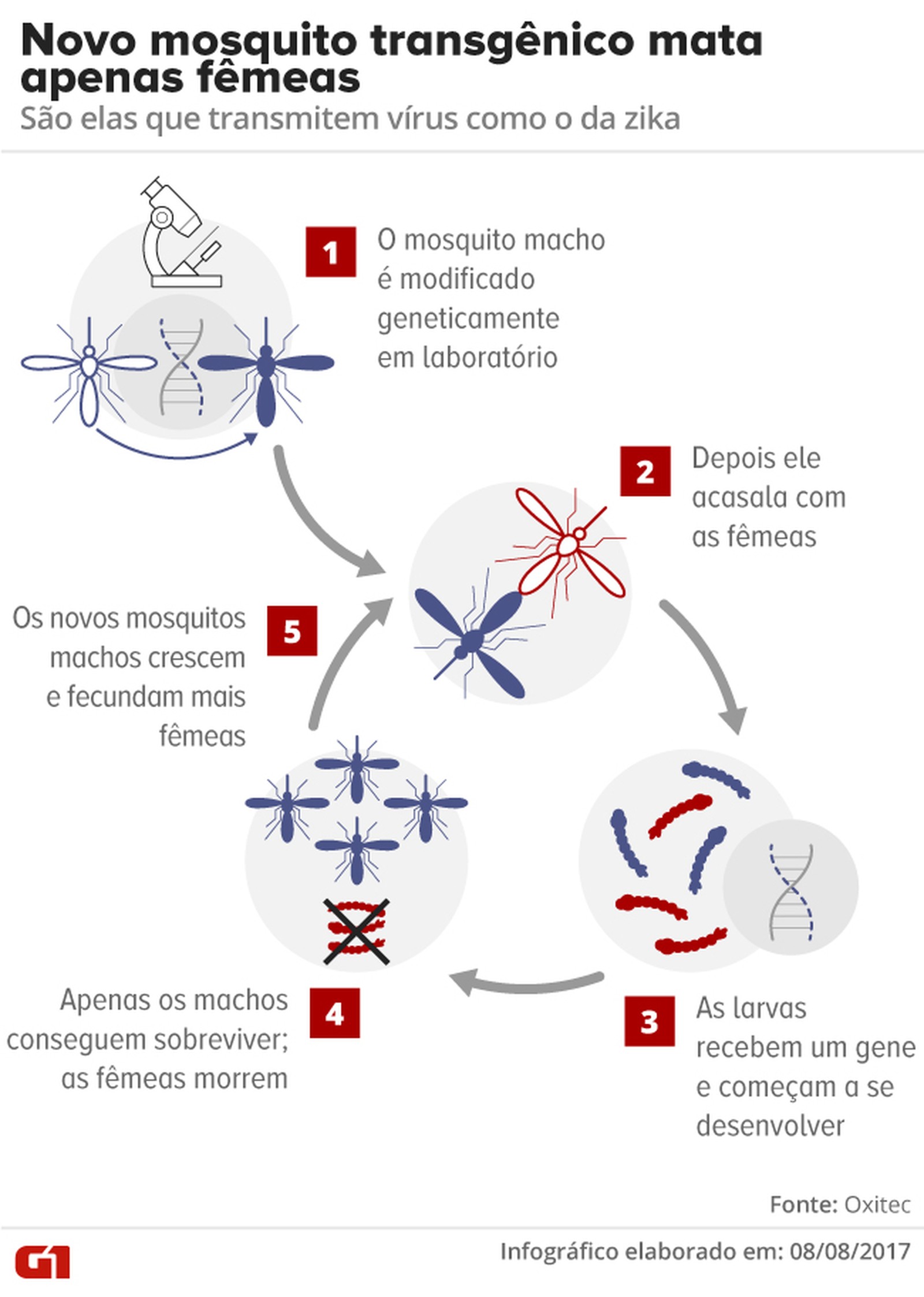 Depois, as fêmeas foram separadas dos machos e descartadas. Em uma próxima etapa, os machos com os genes silenciados foram soltos no ambiente e, ao fertilizarem as fêmeas, tornaram a prole inviável e todas as larvas morreram. Essa é a etapa que a Oxitec testou até agora.