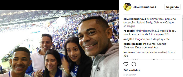 No mês passado, Elivélton e os filhos foram ao Mineirão acompanhar o Cruzeiro contra o Palmeiras pela Copa do Brasil. O empate, em 1 a 1, garantiu a classificação da Raposa, demonstrando, mais uma vez, o pé quente do ídolo cruzeirense.