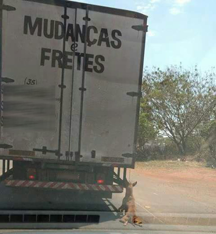 Um motorista registrou uma foto em que um cão aparece enforcado e pendurado em um caminhão de mudanças.