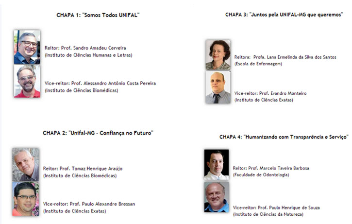 São quatro chapas inscritas com candidatos a reitor e a vice-reitor. A chapa 1, "Somos Todos Unifal", traz como candidato a reitor o cientista político Sandro Amadeu Cerveira, professor do Instituto de Ciências Humanas e Letras, e como vice-reitor Alessandro Antônio Costa Pereira, do Instituto de Ciências Biomédicas.