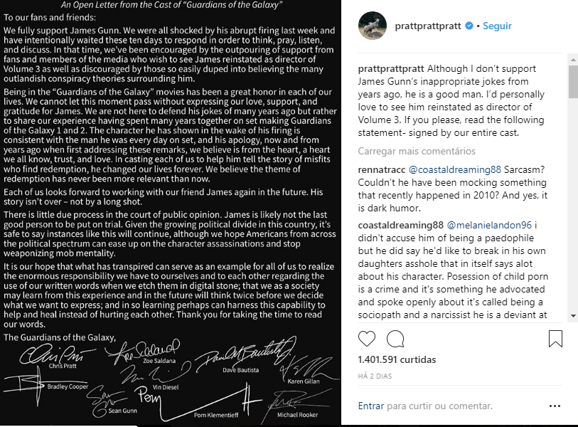 "Cada um de nós está ansioso para trabalhar com nosso amigo James de novo no futuro", diz a carta. Pratt acrescentou em um post no Instagram que, "embora não apoie as piadas inapropriadas de anos atrás" feitas por Gunn, "adoraria vê-lo reintegrado como diretor" do terceiro filme.