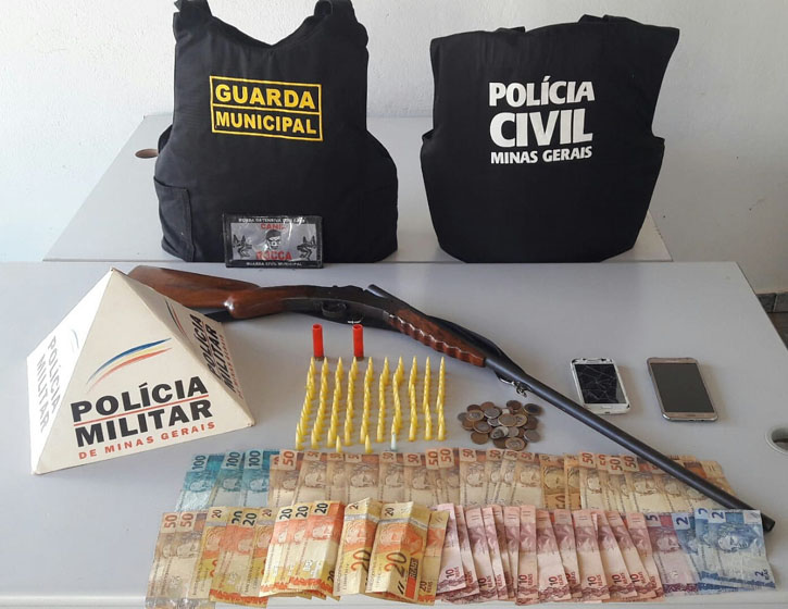 A operação conjunta cumpriu seis mandados judiciais em Alterosa, apreendendo arma e munições (uma espingarda calibre 28 e duas munições intactas calibre 28), dois aparelhos celulares, 123 cápsulas com cocaína, além de R$ 1.854,00 em dinheiro, que pode ser oriundo do tráfico de drogas.