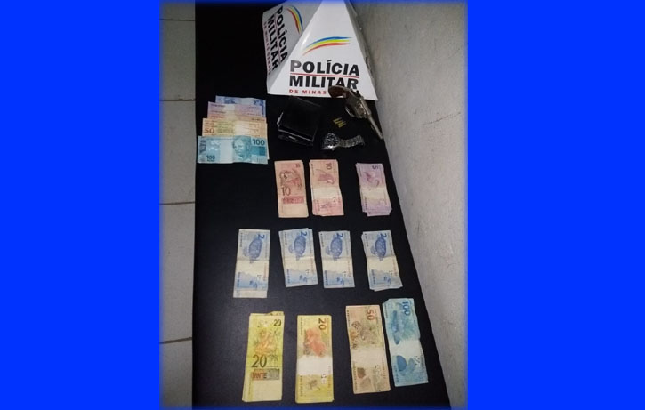 Dinheiro, arma de fogo e outros objetos foram apreendidos durante a ocorrência (Foto: PM/Divulgação)