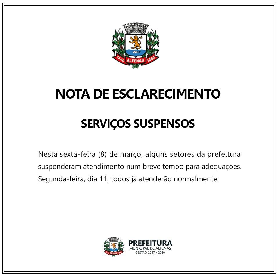 A Prefeitura de Alfenas divulgou uma nota oficial na qual nega a informação de que o atendimento ao público na segunda-feira seria suspenso. Um áudio, circulando em grupos de whatsapp, informava que o atendimento ao público seria interrompido, mas a informação é falsa segundo o governo.