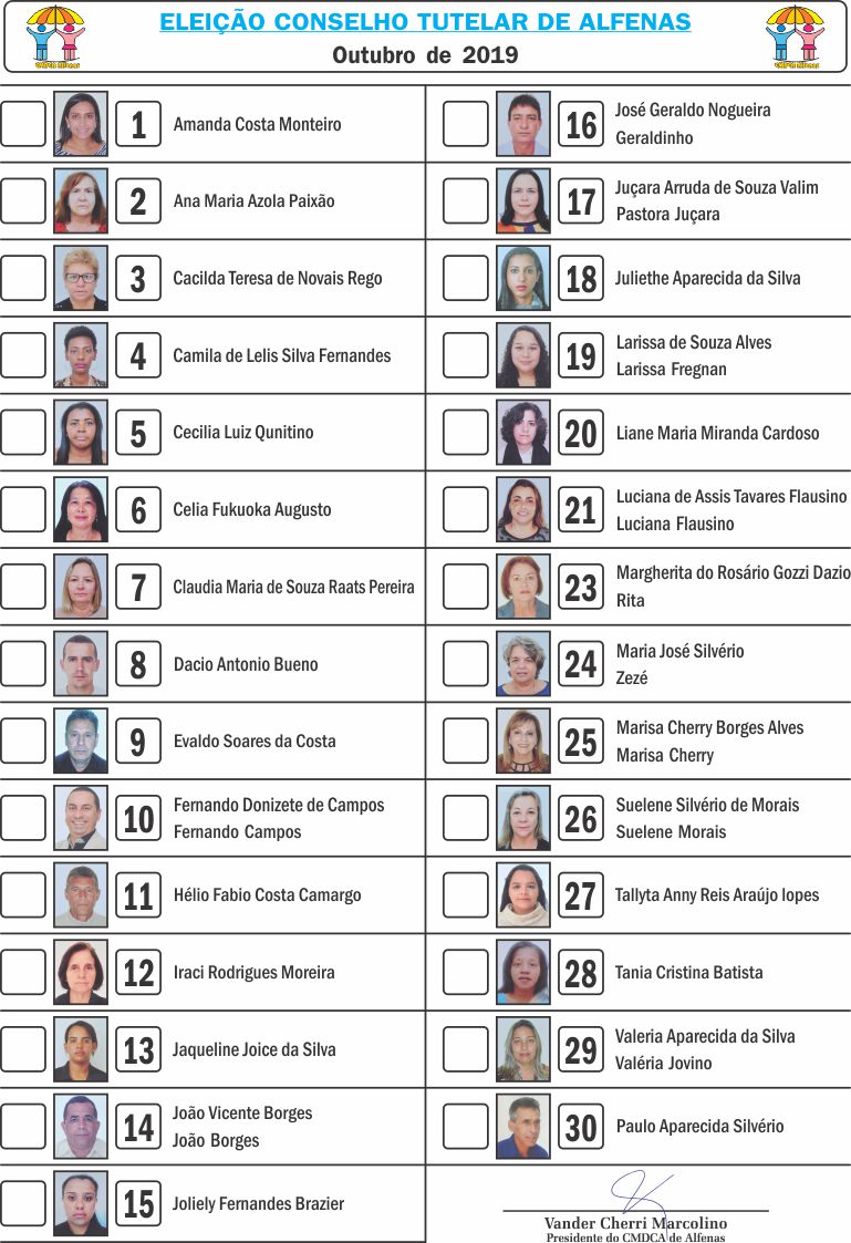 A eleição para escolha dos próximos conselheiros tutelares de Alfenas será realizada no domingo, dia 6, das 8h às 15h na Escola Municipal Antônio Joaquim Vieira (Polivalente). Vinte e nove candidatos estão na disputa. O candidato de número 22 desisitu da disputa e não aparece na relação. Confira o número de cada candidato.