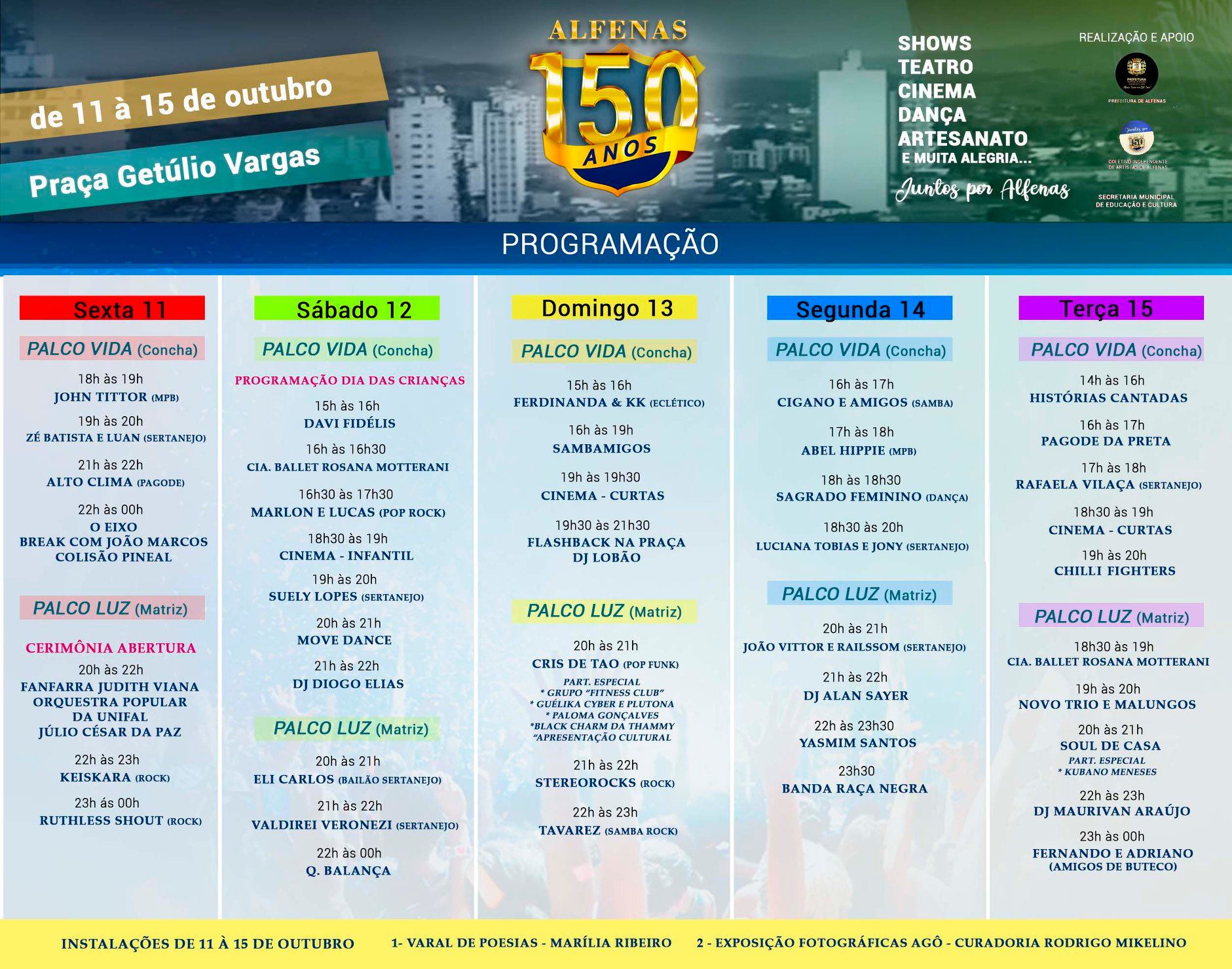 As comemorações dos 150 anos de Alfenas terão início na sexta-feira, 11, na praça Getúlio Vargas. O evento acontece de 11 a 15 de outubro, sendo uma realização da Prefeitura e dos produtores culturais do município.