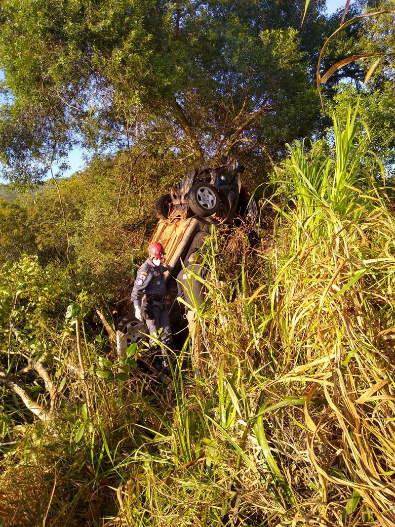 Um veículo Peugeot capotou na rodovia LMG 879, que liga o bairro Pinheirinho a rodovia BR 481, na manhã desta quarta-feira, dia 24. Apesar do acidente, a motorista teve apenas lesões leves, segundo o Corpo de Bombeiros.