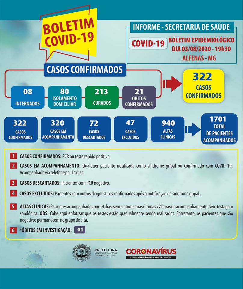 De acordo com o boletim epidemiológico, divulgado no início da noite de segunda-feira pela Secretaria de Saúde de Alfenas, são oito pacientes de Alfenas que seguem internados no HSC, referência regional para caso de Covid-19.