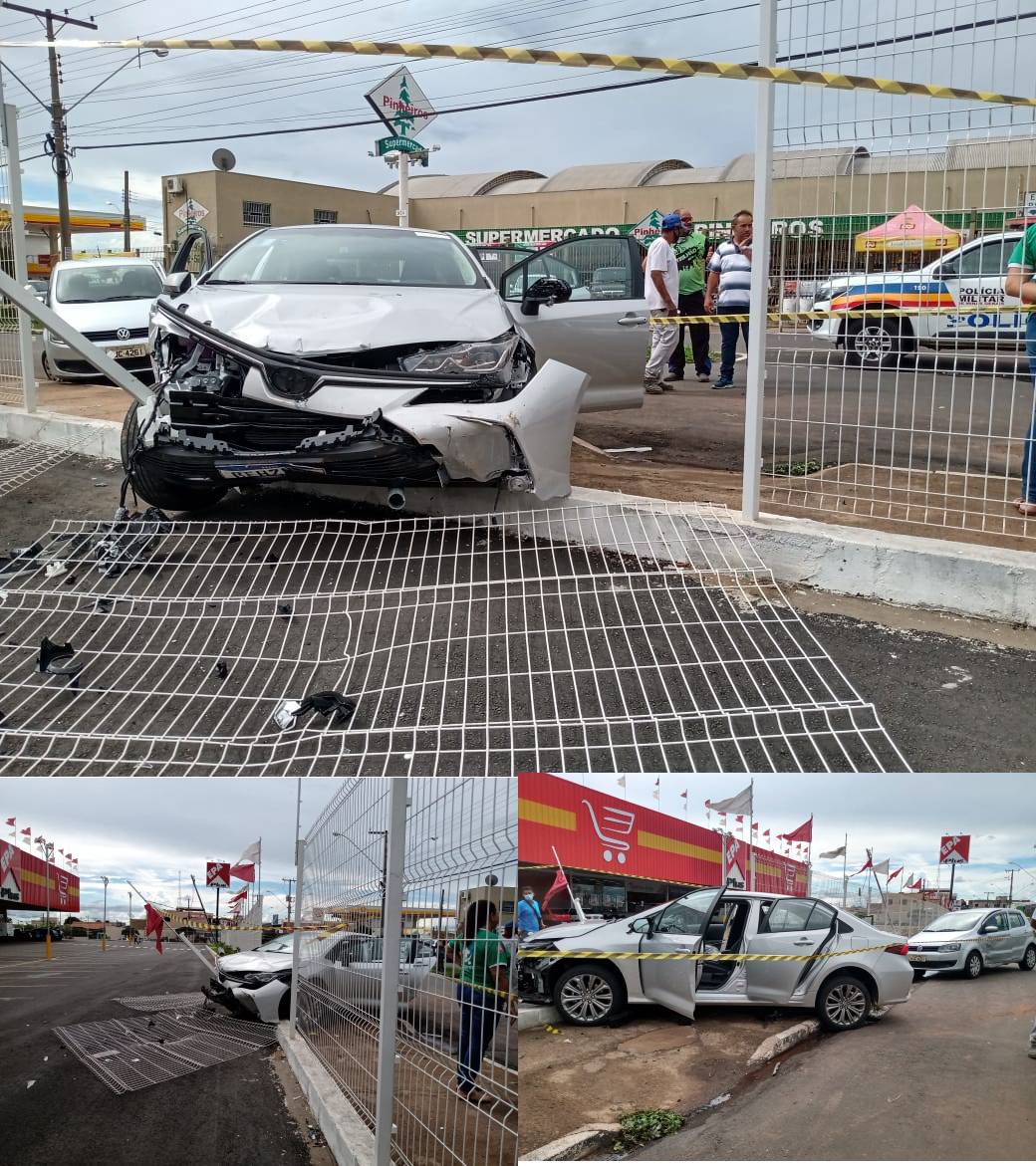 Suspeito em fuga bate em vários carros e derruba alambrado de supermercado