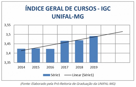 O pró-reitor explica que o IGC é calculado anualmente desde a criação em 2007, porém, o cálculo passou por períodos de consolidação até chegar à atual fórmula utilizada desde 2014. A fórmula envolve variáveis relacionadas aos cursos de graduação pelo Conceito Preliminar de Curso (CPC), aos programas de pós-graduação stricto sensu, por meio do Conceito Capes e ao número de estudantes matriculados nesses cursos e programas. “Neste período, entre 2014 e 2019, nós temos um crescimento bem pontuado”, aponta a respeito da série histórica de crescimento do IGC da Unifal.